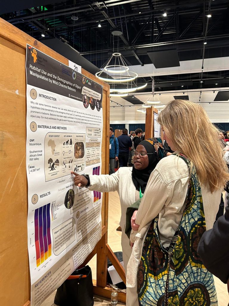 Rassina presented her poster on Habitat Use and the Demographics of Object Manipulation by Wild Chacma Baboons. This work, based on her field research in Gorongosa National Park, Mozambique, provides new insights into how wild baboons interact with their environment and how individual and group behaviors vary across habitats.